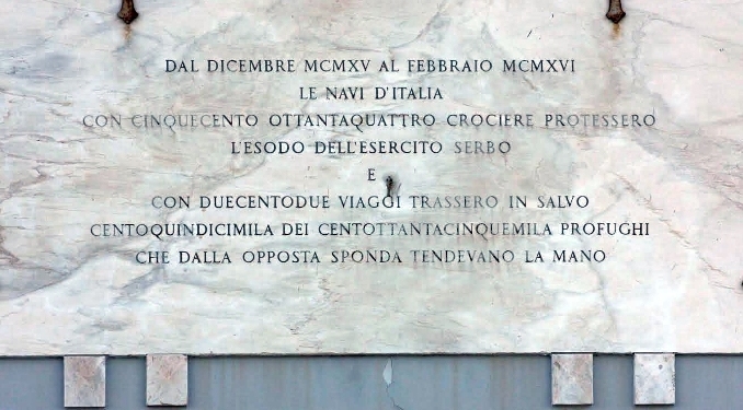 “Dal dicembre 1915 al febbraio 1916 – le navi d’Italia – con cinquecento ottantaquattro crociere protessero l’esodo dell’Esercito serbo e, con duecento due viaggi trassero in salvo centoquindicimila dei centosettantacinque mila profughi che dall’opposta sponda tendevano la mano”.
