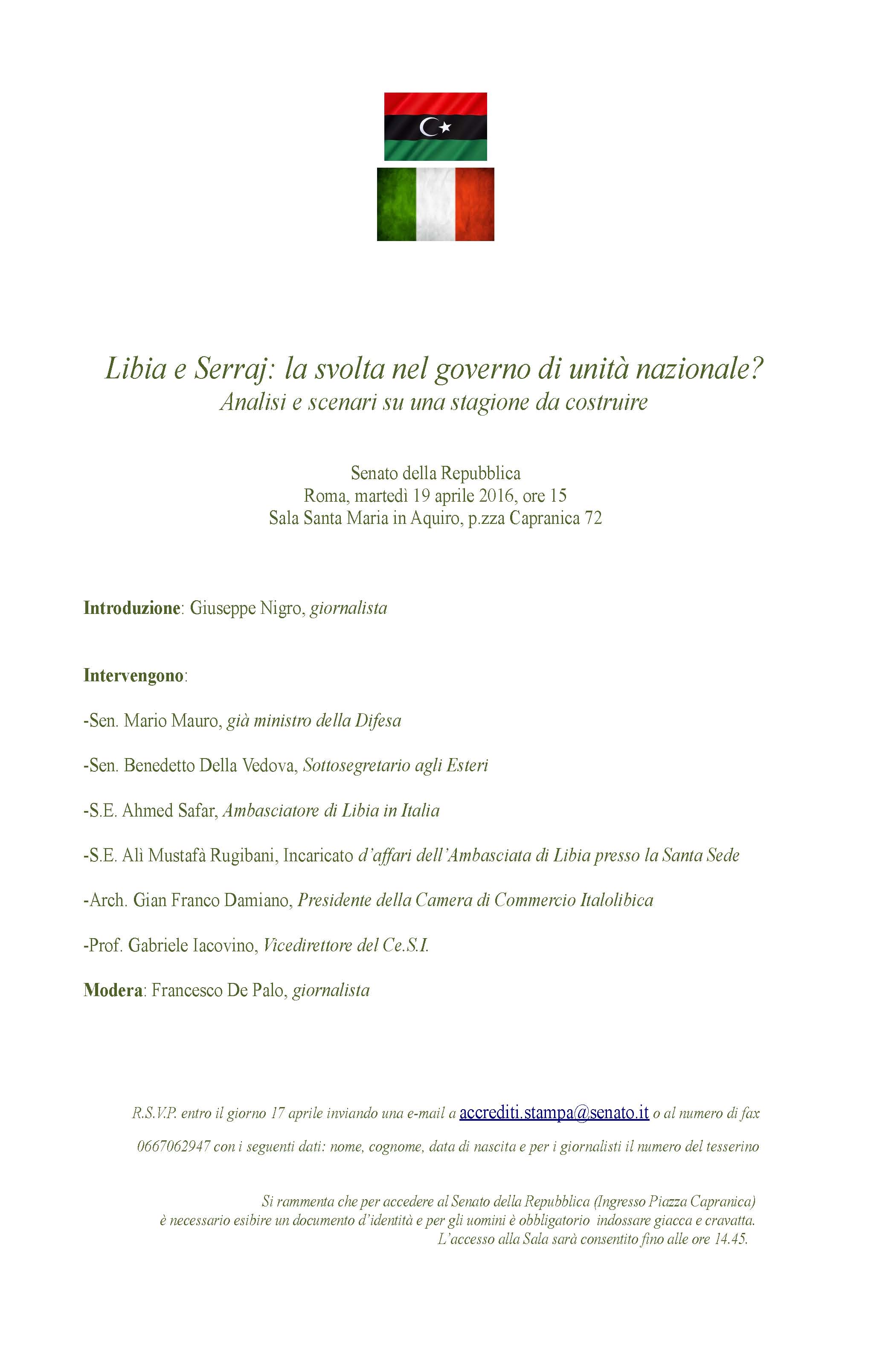 R.S.V.P. entro il giorno 17 aprile inviando una e-mail a accrediti.stampa@senato.it o al numero di fax 0667062947 con i seguenti dati: nome, cognome, data di nascita e per i giornalisti il numero del tesserino