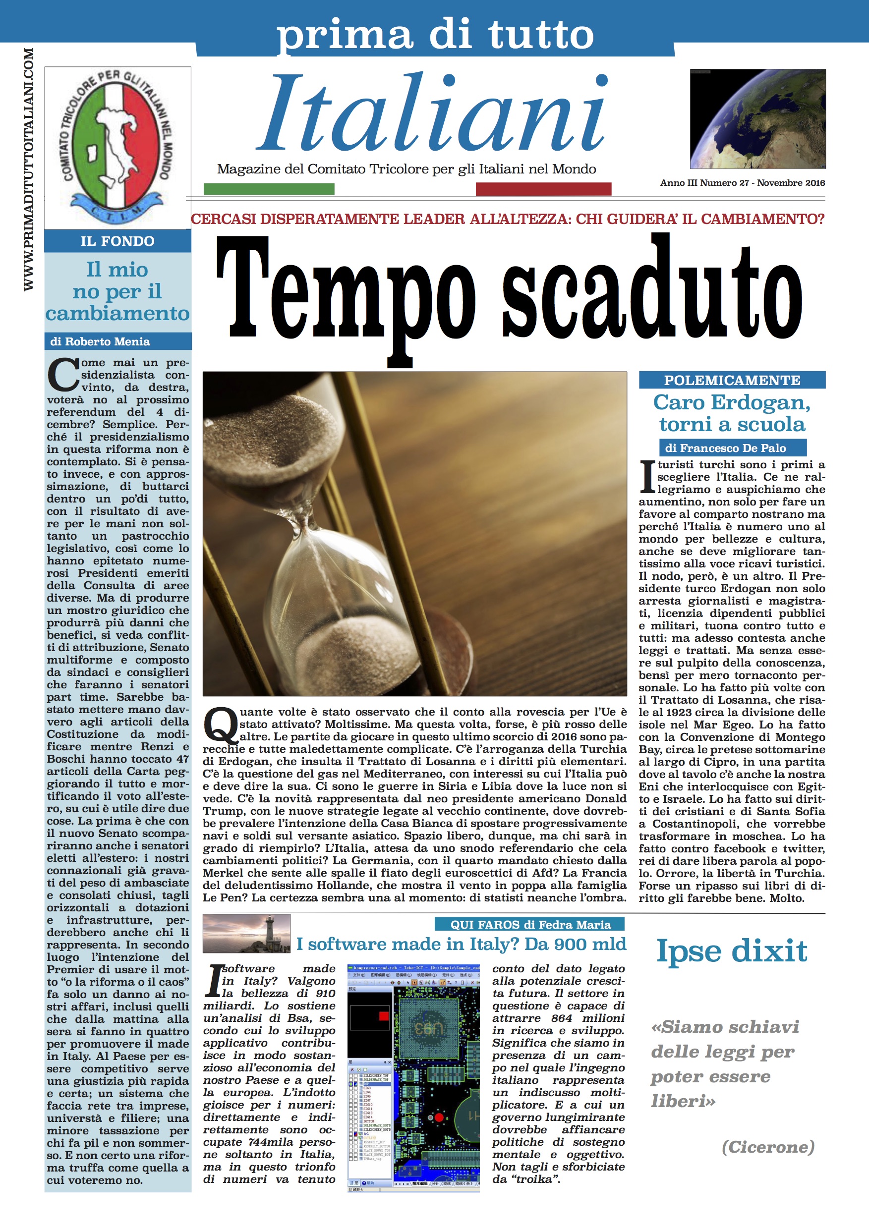Nel nuovo numero un’interessante riflessione di Claudio Antonelli sull’evoluzione degli emigranti italiani, la campagna per il no al referendum condotta dal Ctim tra gli italiani all’estero, il centenario della stesura di “Uno, nessuno e centomila” di Pirandello vergato da Enzo Terzi e l’ottimo risultato della nuova Alfa Romeo Giulia, vincitrice del Volante d’oro 2016.