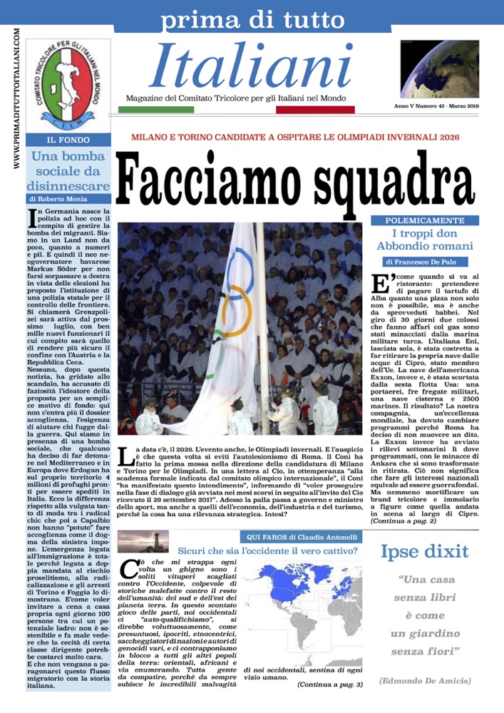 “Facciamo squadra” è il titolo di apertura del numero di marzo di Prima di Tutto Italiani.