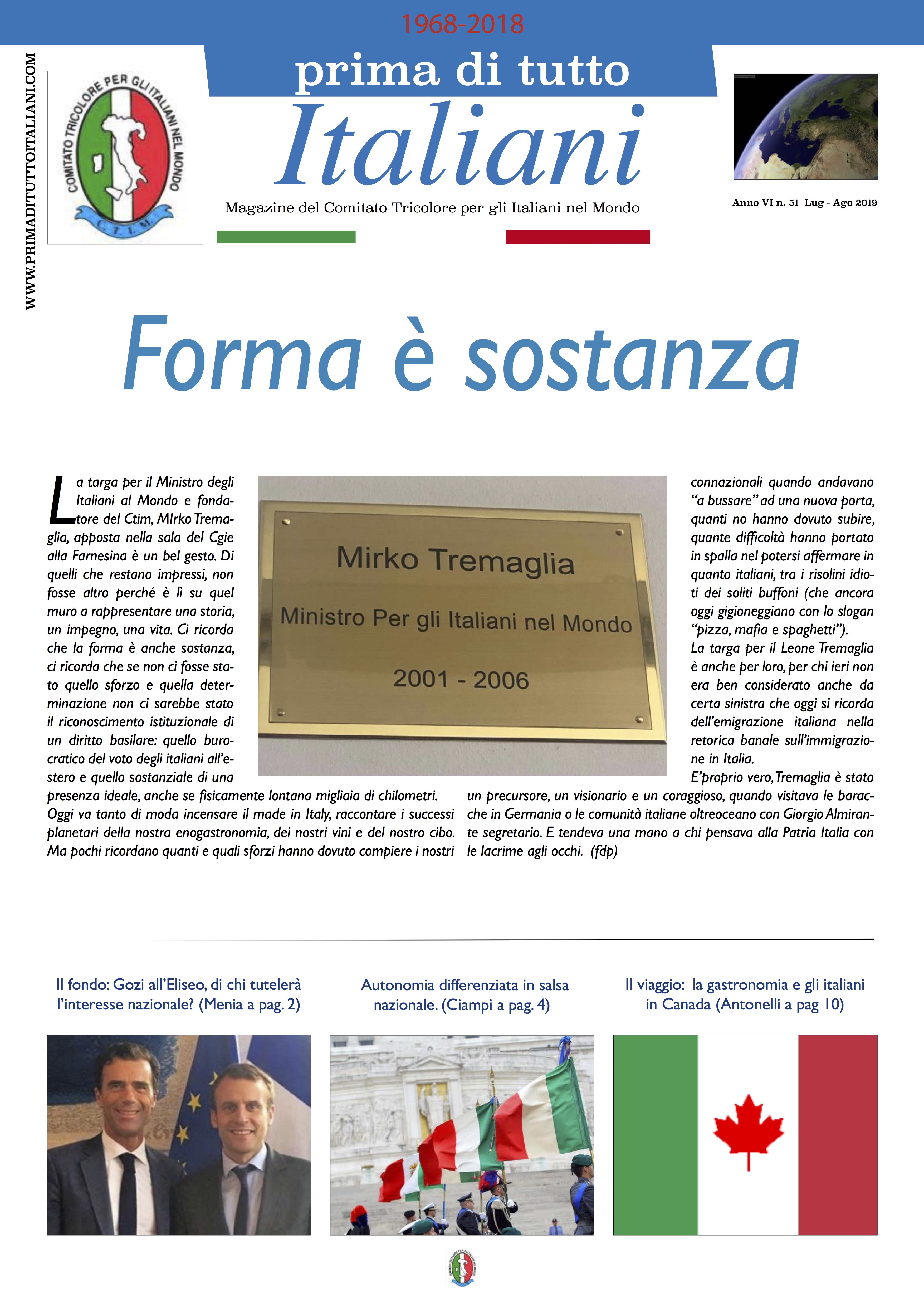 Forma è sostanza. Questo il titolo di apertura del nuovo numero di Prima di Tutto Italiani dedicato alla targa per Mirko Tremaglia apposta nella sala Cgie della Farnesina.
