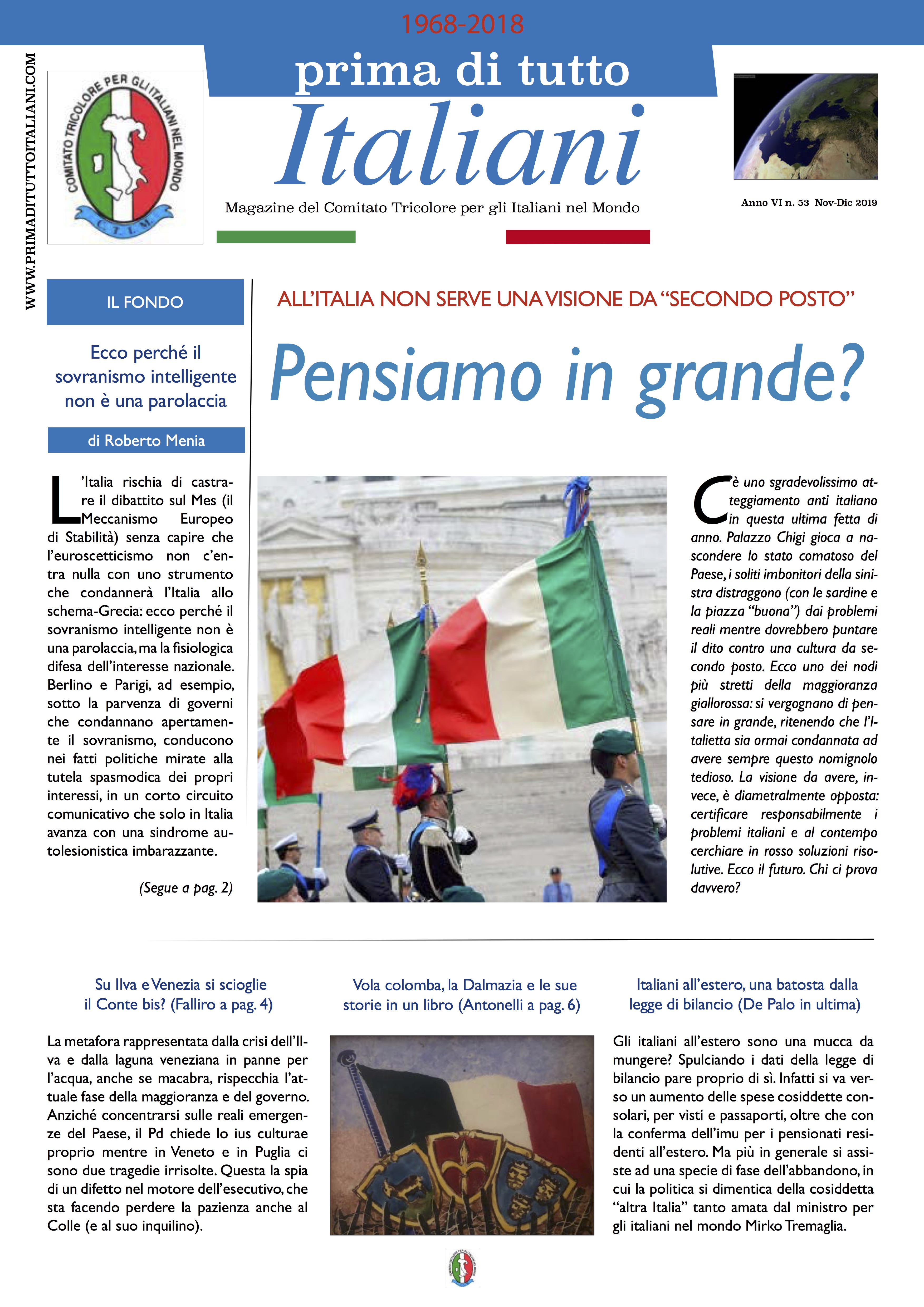 Da segnalare sul nuovo numero il fondo di Roberto Menia sul sovranismo intelligente tra Mes e Troika, l’analisi sul taglio dei parlamentari che investe anche gli italiani all’estero, la storia di Dalmazia raccontata da Claudio Antonelli e i rischi connessi all’assenza italiana in tre tavoli strategici come Libia, Siria e Mediterraneo.