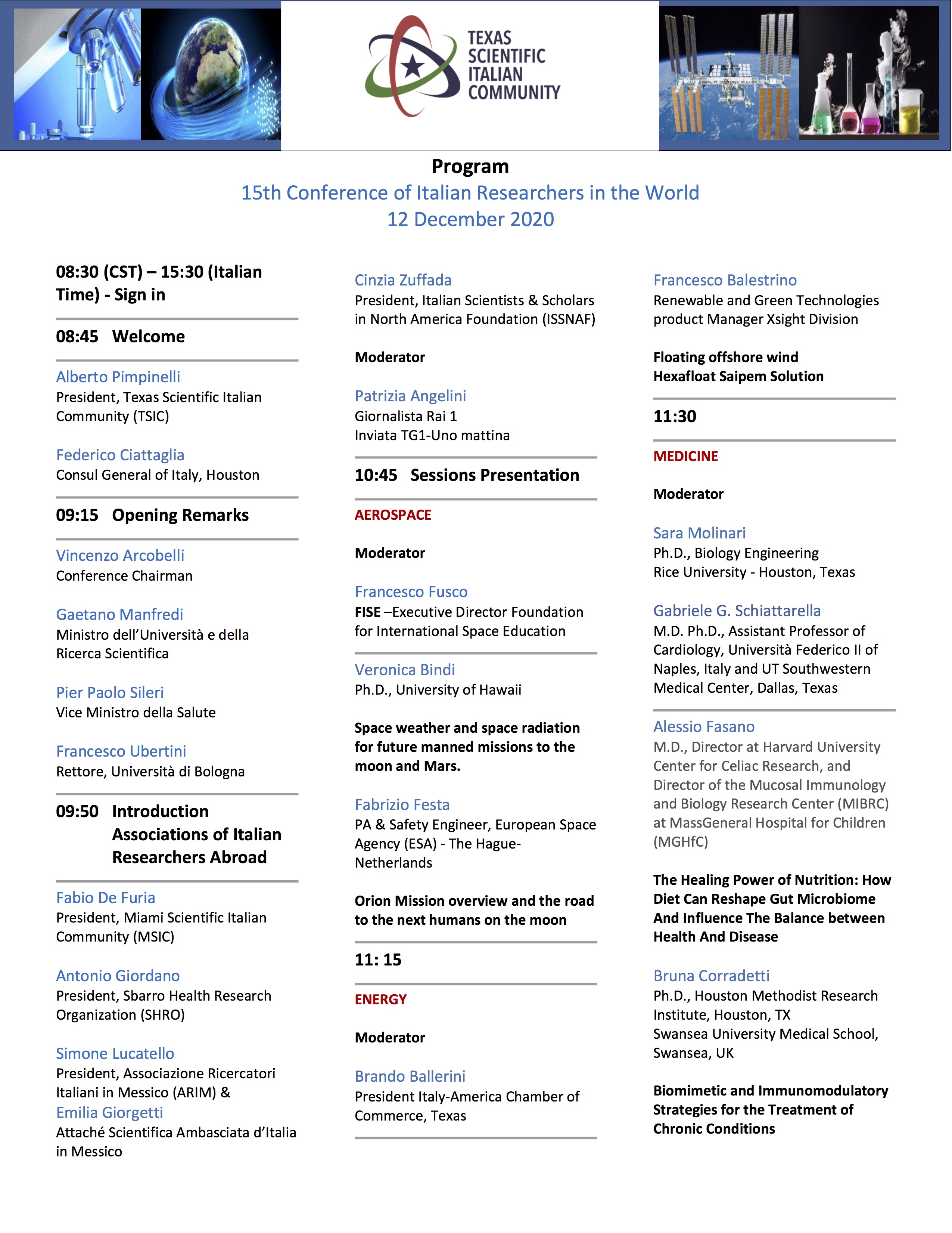 The XV Conference of Italian Researchers in the World is only a few days away and we can’t be more excited to see so many interesting topics, in different fields of science, technology, medicine, and humanities, with outstanding speakers and moderators, as well as several important endorsements and auspices received for the event organized by the Texas Scientific Italian Community in collaboration with Rice University.