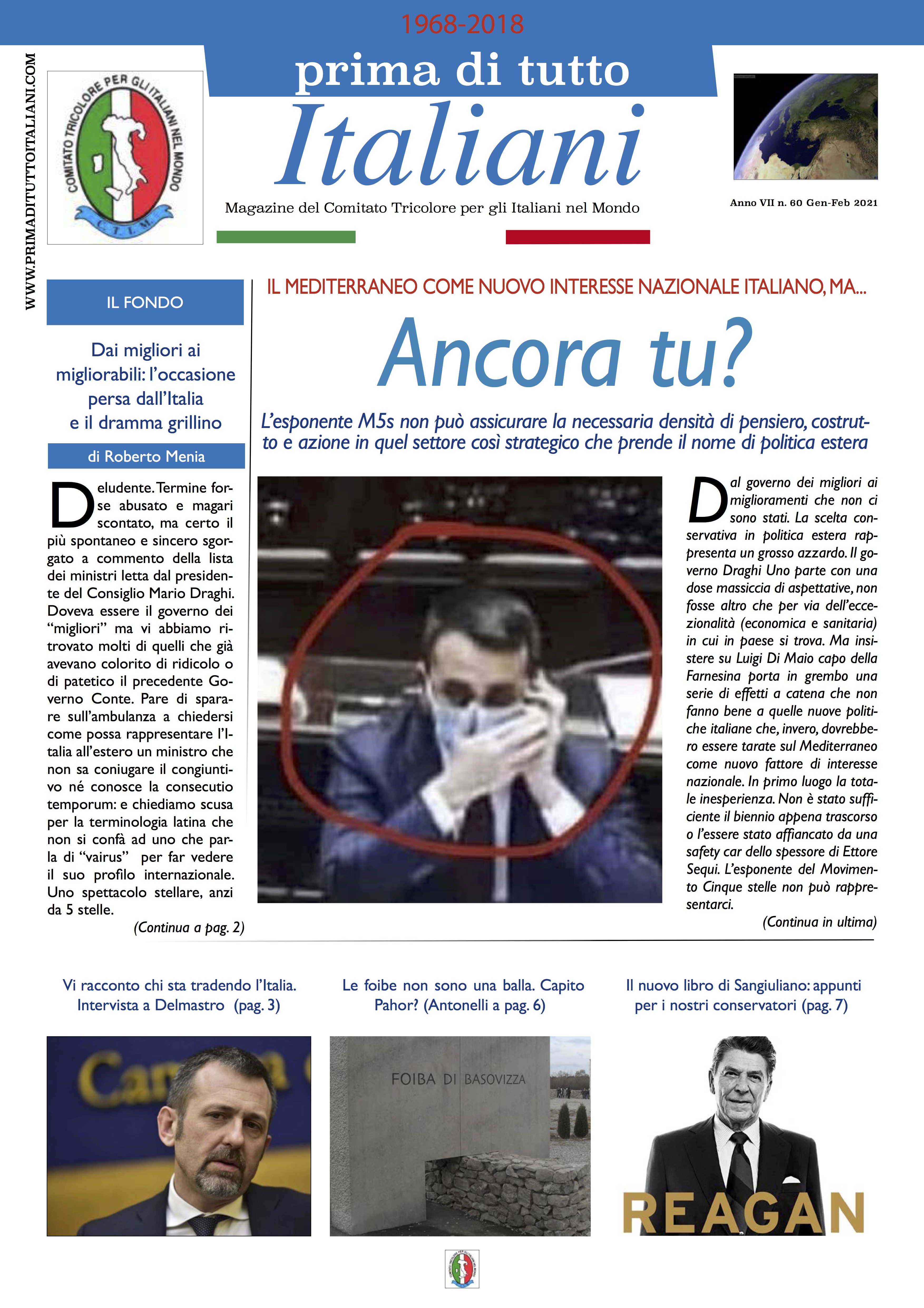 “Ancora tu?” è il titolo scelto per il nuovo numero di PrimaDiTuttoItaliani, con riferimento alla conferma alla Farnesina dell’esponente Cinque stelle, inadeguato ad assicurare la necessaria densità di pensiero, costrutto e azione in quel settore così strategico per l’Italia che prende il nome di politica estera. (Cliccare qui per scaricarlo).