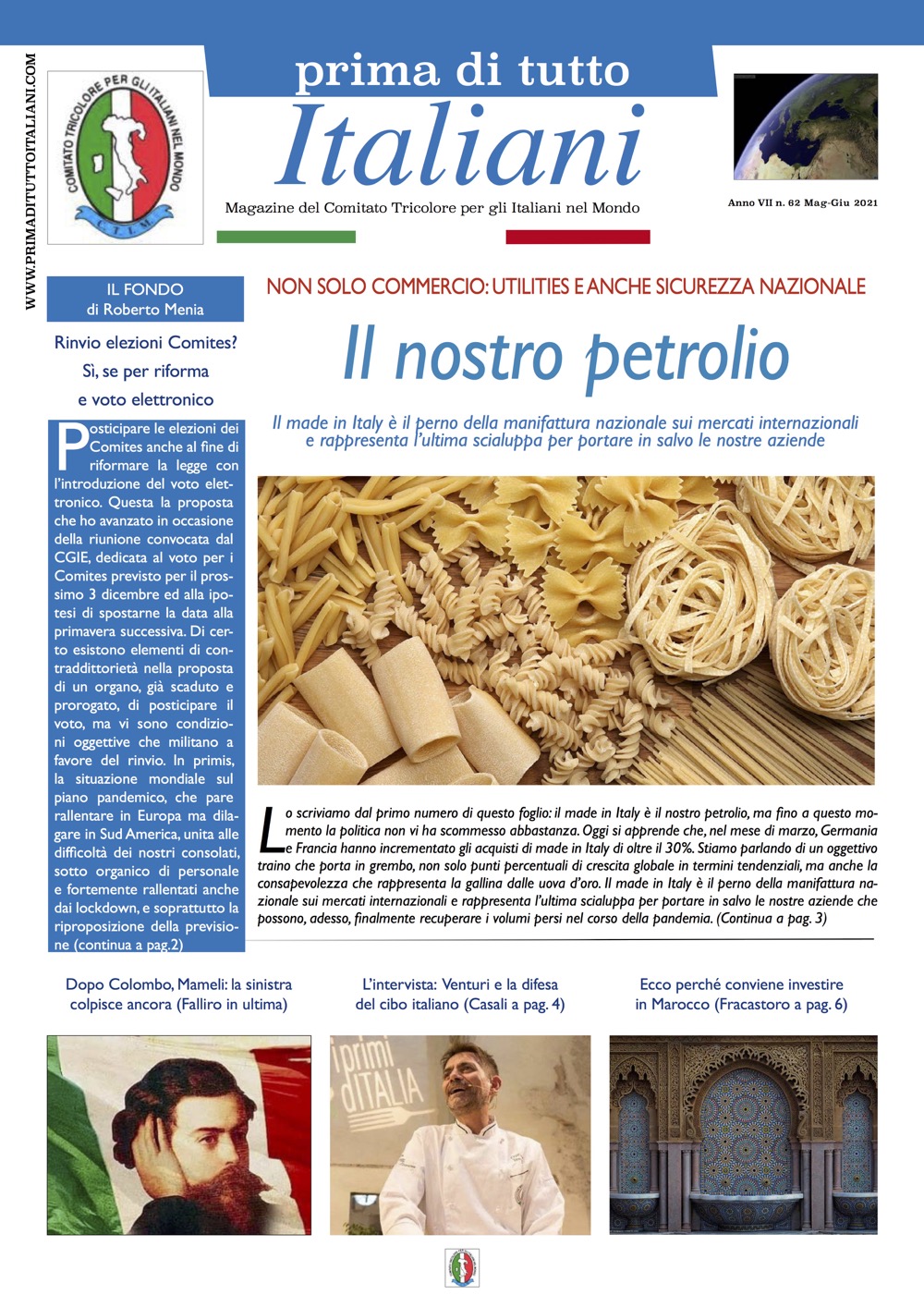 Da segnalare sul nuovo numero il fondo di Roberto Menia sul rivio delle elezioni Comites, l’intervista allo chef Cristiano Venturi, presidente dell’Associazione Professionale Cuochi Italiani Francia (APCI), lo scandalo di presunto spionaggio del Psoe al Parlamento Europeo, la polemica su Bella Ciao come nuovo Inno Nazionale italiano.