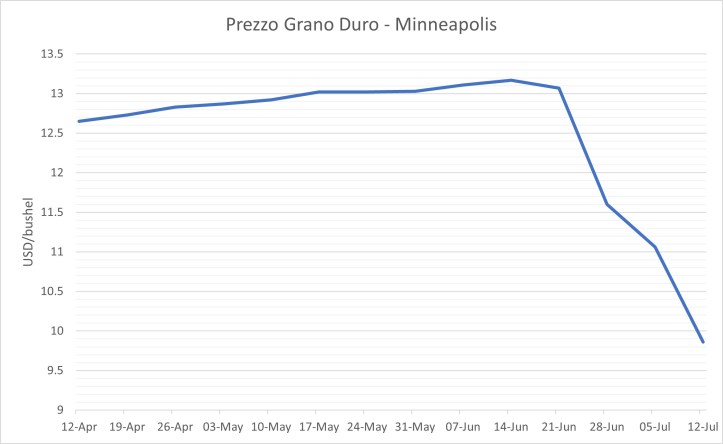 Solo l’arrivo del nuovo raccolto che, in tempi di possibili carestie da siccità e guerra, grazie al cielo è in corso ed è abbondante. Tra parentesi, Chicago non è il mercato di riferimento per il duro, lo è Minneapolis. Ad ogni buon conto i prezzi sia a Chicago (grano tenero) che Minneapolis (duro) sono in forte calo per l’arrivo del nuovo raccolto che in Nord America, come da noi, avviene adesso, non tra quattro mesi in autunno.