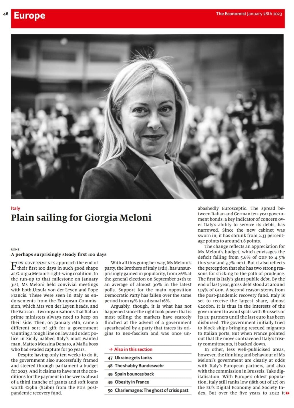 Si legge sul quotidiano francese che “da 100 giorni, ripetendo ‘l’importante è tenere conto della realtà’, si è molto saggiamente allineata sulla scia di Mario Draghi, riprendendo alla lettere la quasi totalità delle sue politiche: ha presentato a Bruxelles un bilancio 2023 che riprende i grandi equilibri del suo predecessore, anche con un certo rigore, e ha saputo rinunciare rapidamente ai simboli che irritavano Bruxelles”.